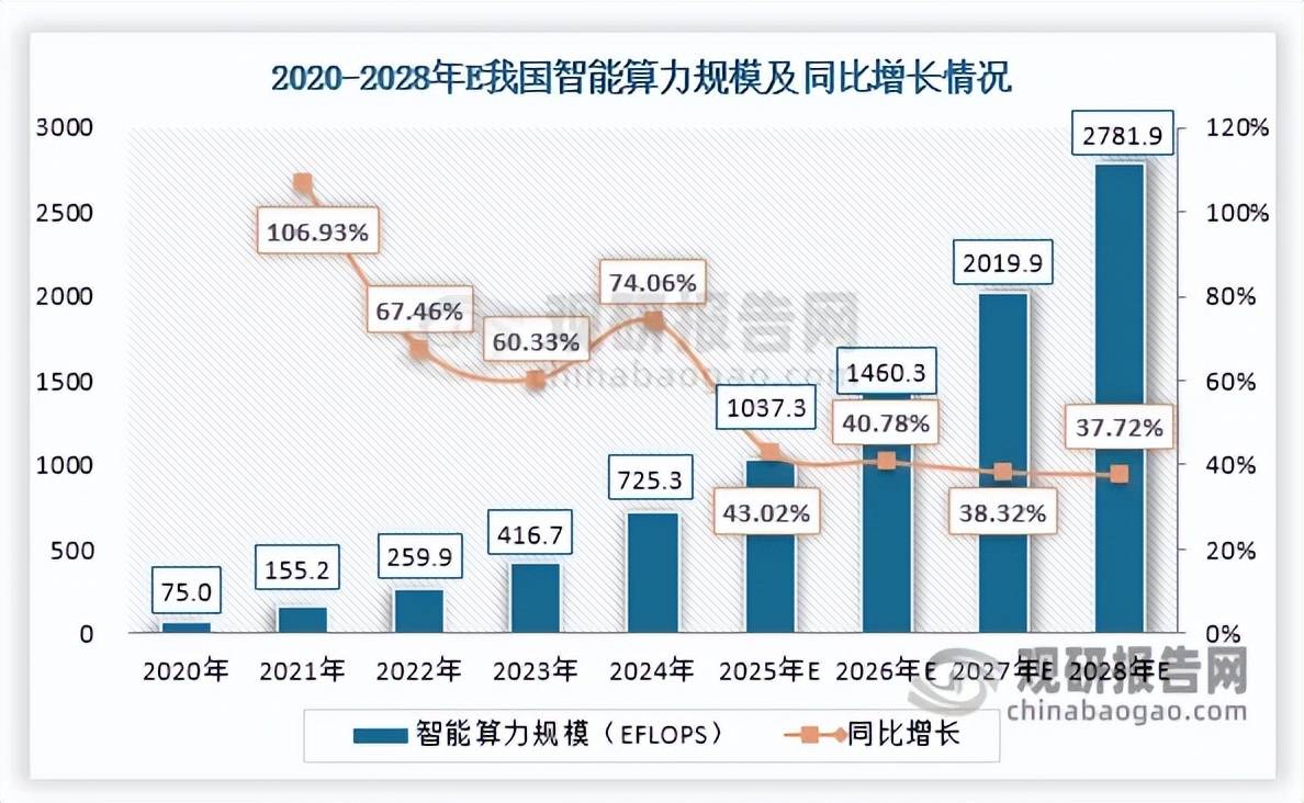 根据观研报告网发布的《中国算力服务器电源行业发展深度分析与投资前景预测报告(2026-2033年)》显示,在我国AI产业快速发展、算力规模持续扩容,尤其是智能算力规模高速增长的背景下,作为算力核心基础设施的算力服务器市场需求同步攀升,为算力服务器电源行业带来重大发展机遇与广阔市场空间。数据显示,2020-2024年我国通用算力规模从39.6EFLOPS增至71.5EFLOPS,预计2028年达140.1EFLOPS,2020-2028年年均复合增长率约17.11%;而智能算力增长更为迅猛,同期从75.0EFLOPS激增至725.3EFLOPS,预计2028年扩至2781.9EFLOPS,期间年均复合增长率高达57.09%。智能算力规模的快速增长持续推动算力服务器向高功率、高密度架构升级,算力服务器电源作为保障这类高规格设备稳定运行、充分释放算力性能的核心供电支撑,市场需求也随之被持续且强劲地拉动。