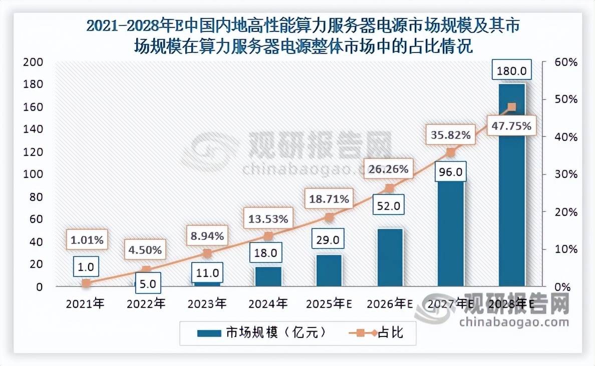 数据显示,中国内地高性能算力服务器电源市场规模由2021年的1亿元激增至2024年的18亿元,预计2028年将突破180亿元,2021-2028年年均复合增长率高达109.98%,显著高于服务器电源整体市场21.05%的增速;其在服务器电源整体市场中的占比也将从2021年的1.01%大幅提升至2028年的47.75%,成为驱动行业增长的重要力量。