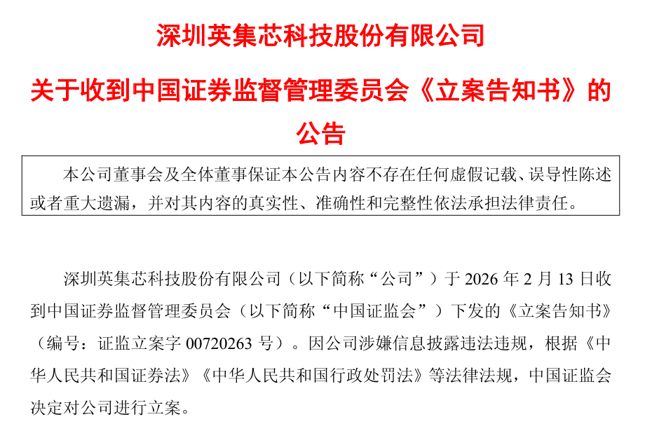 2月13日晚间,英集芯亦公告称,其收到证监会下发的立案告知书。因公司涉嫌信息披露违法违规,证监会决定对公司进行立案。