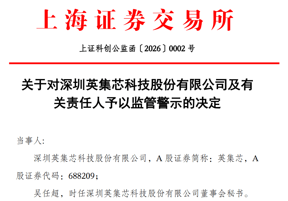 1月7日,英集芯股价走高,截至当日收盘仍上涨4.51%。1月7日深夜,监管处理结果第一时间落地。上交所对英集芯及时任董事会秘书吴任超予以监管警示。